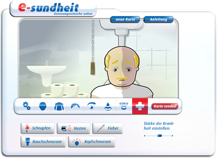 Mit diesem Konfigurator können Kunden der Versandapotheke Aponeo ihren Bekannten eine Genesungs-Ecard senden, abgestimmt auf das Aussehen der kranken Person. Es stehen die fünf beliebtesten Volkskrankheiten zur Auswahl – anpassbar an die Stärke des Leids.