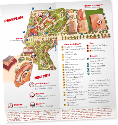 Der gemeinsame Nenner gibt den verschiedenen Angeboten und Attraktionen des Filmparks eine einheitliche Basis. Darauf aufbauend können unterschiedlichste Zielgruppen vom actiongeilen Teenie bis zum ostalgischen Rentner ganz individuell angesprochen werden. Der große Jahresflyer fasst das Repertoir des Filmparks zusammen – in erster Linie für Business-Kunden wie Reiseunternehmen. Für spezielle Zielgruppen wie Schüler oder Familien gab es eigens kleinere Versionen des Flyers.
