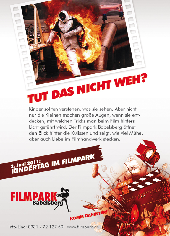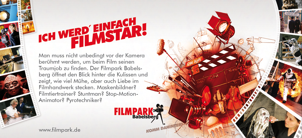 "Im Filpark Babelsberg kann man in die fantastischen Welten des Films eintauchen und lernen, wie diese entstehen." In einem gemeinsamen Workshop wurde das "Filmpark-Gefühl" identifiziert, eine Positionierung gegenüber der Konkurrenz gefunden und eine Webdesign Kommunikationsstrategie mit breitem Fundament aber sehr zielgruppengenauen Spitzen erarbeitet.