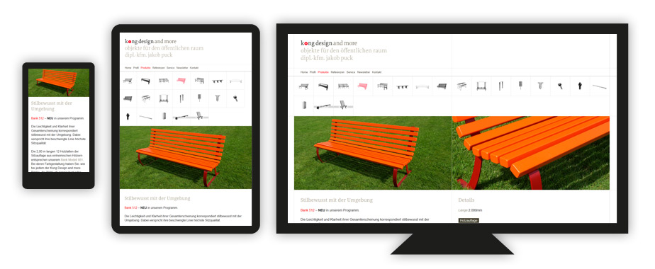 kong design and more gestalten und vertreiben Objekte für den öffentlichen Raum. Auch das Layout der neuen Website macht das Beste aus dem sich bietenden Raum und passt sich automatisch an die Screengröße an. Smartphone-User können sich mithilfe einer Karte, die Refernez-Objekte in der Nähe zeigt, direkt vor Ort von Qualität und Stil der Produkte überzeugen.